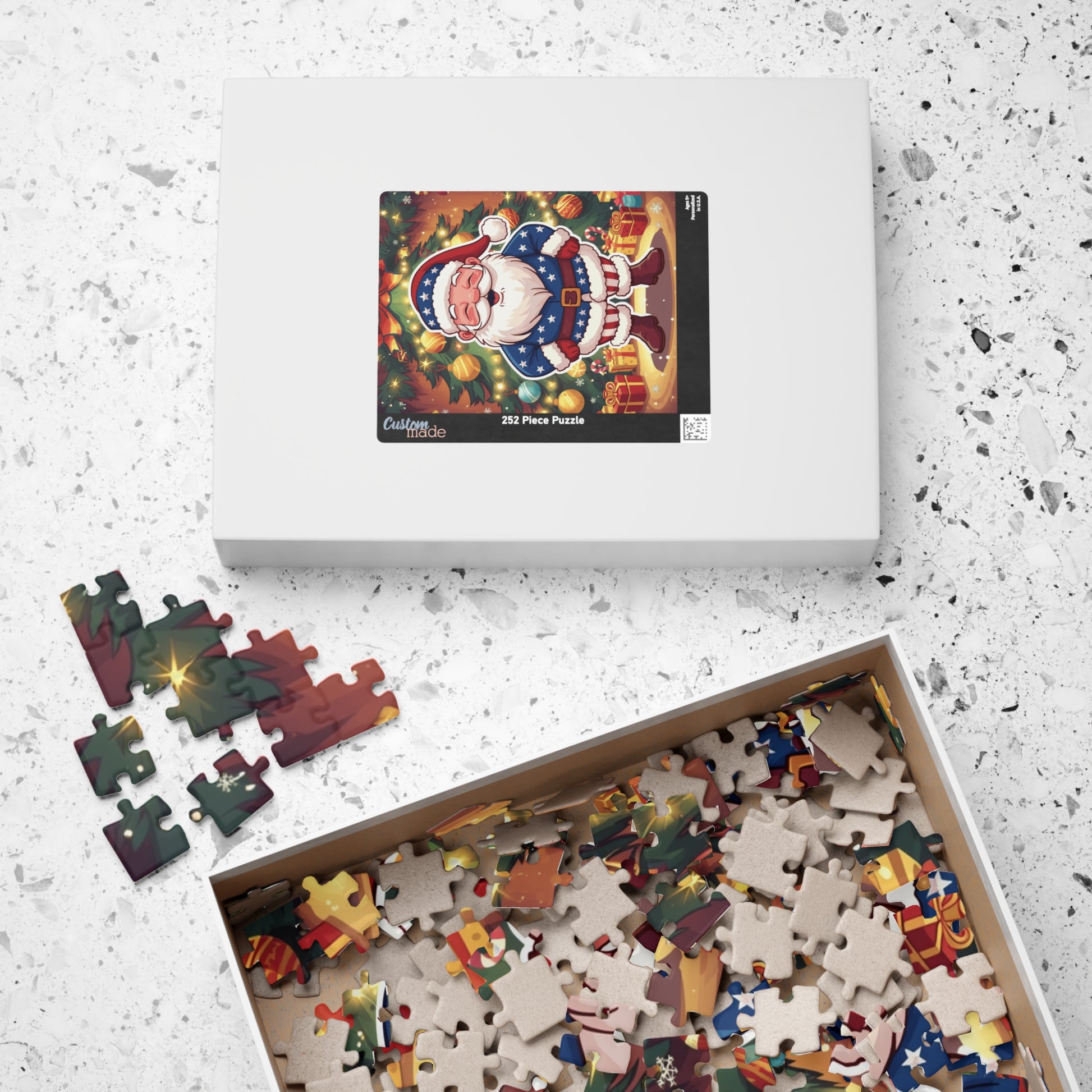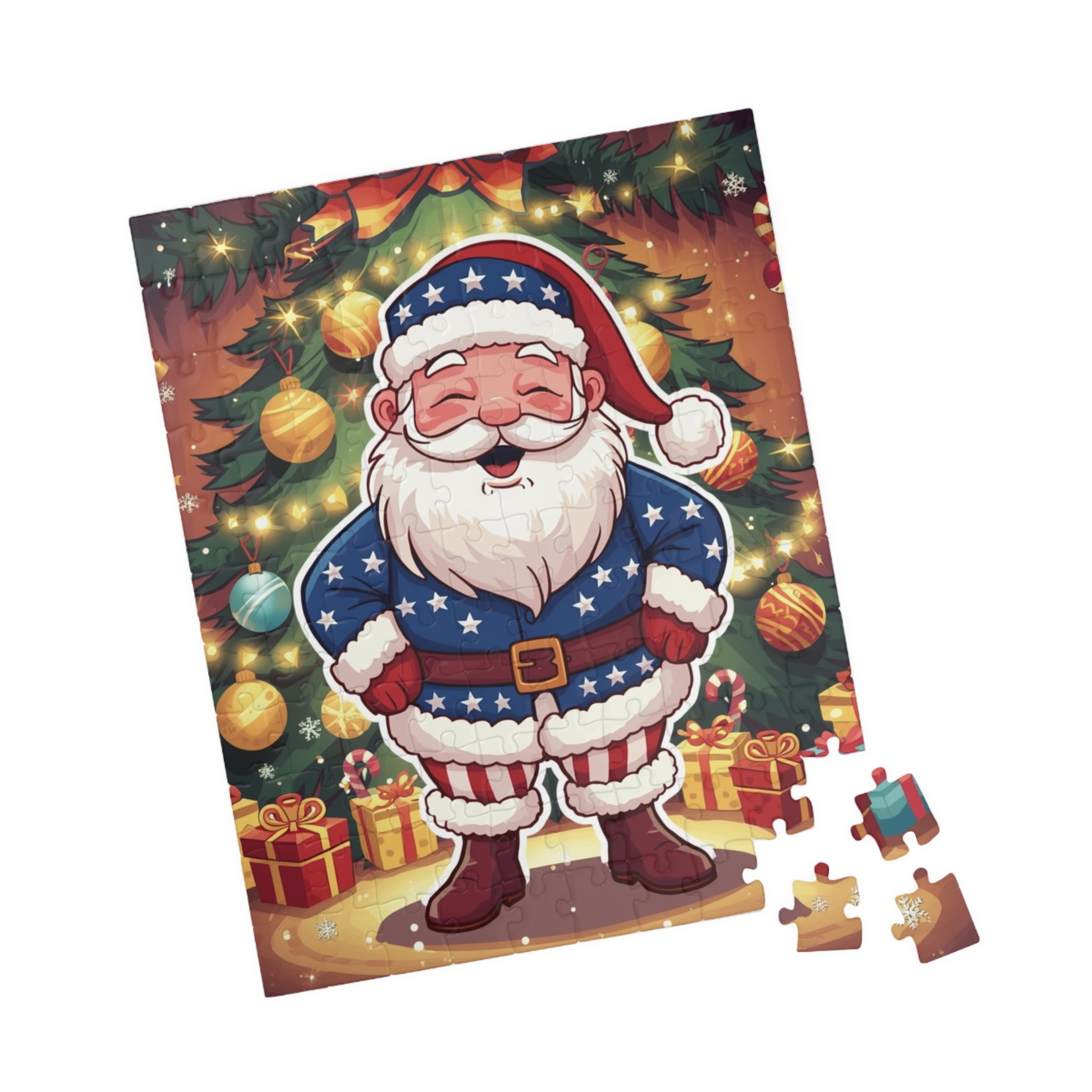 Gather around the tree and slow the world down with this cheerful holiday puzzle. A jolly Santa in patriotic blues and reds stands before a twinkling evergreen, surrounded by ornaments and neatly wrapped presents. Each piece snaps together with satisfying weight — the sharp, glossy print keeps every ornament and twinkle vivid as you work. Choose from bite-sized 110 or 252-piece sessions, a mid-length 520 challenge, or the full 1014-piece evening project. Finished puzzles make a cozy mantle display or a family game-night centerpiece that invites story-swapping and laughter.